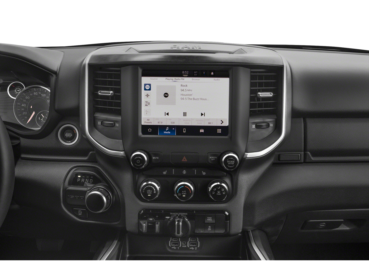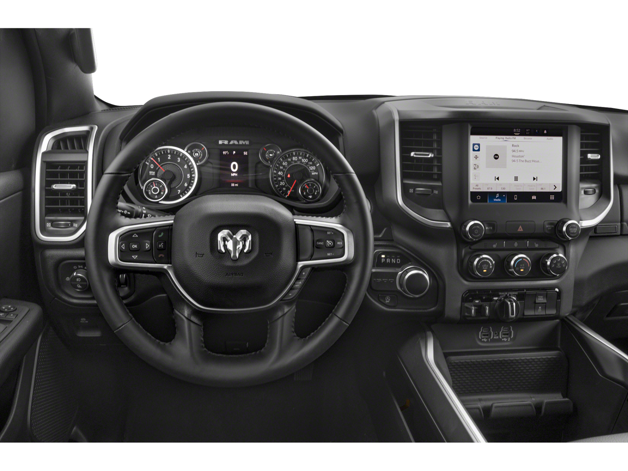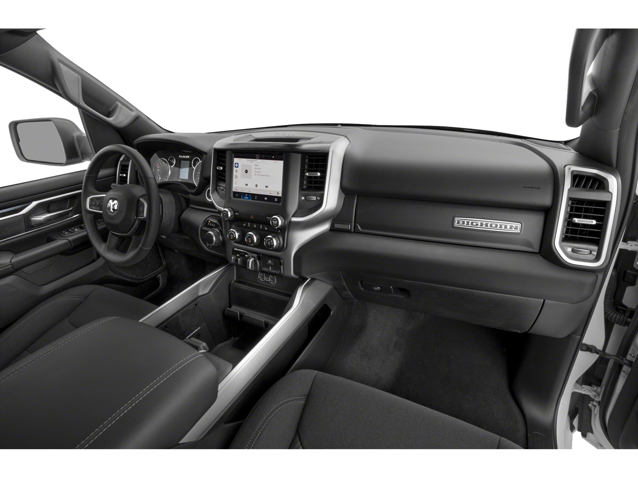 115V Auxiliary Power Outlet, 12 Touchscreen Display, 2nd Row In Floor Storage Bins, 3 Rear Seat Head Restraints, 4 Way Front Headrests, 400W Inverter, 4G LTE Wi-Fi Hot Spot, 9 Amplified Speakers w/Subwoofer, Air Conditioning ATC w/Dual Zone Control, All R1 High Radios, All Radio Equipped Vehicles, Apple CarPlay, Auto-Dimming Exterior Driver Mirror, Auto-Dimming Rear-View Mirror, Big Horn Level B Equipment Group, Black Exterior Mirrors, Black Interior Accents, Black Premium Power Mirrors, Body Color Door Handles, Body Color Exterior Mirrors, Body Color Front Bumper, Body Color Premium Power Mirrors, Body Color Rear Bumper w/Step Pads, Bucket Seats, Center Console Parts Module, Class IV Receiver Hitch, Cluster 7.0 TFT Color Display, Connected Travel & Traffic Services, Connectivity - US/Canada, Convex Wide-Angle Exterior Mirror Insert, Deluxe Cloth Bucket Seats, Disassociated Touchscreen Display, Exterior Mirrors Courtesy Lamps, Exterior Mirrors w/Heating Element, Exterior Mirrors w/Supplemental Signals, For Details, Visit DriveUconnect.com, For More Info, Call 800-643-2112, Front Fog Lamps, Front LED Fog Lamps, Front Seat Back Map Pockets, Full Length Floor Console, Global Telematics Box Module (TBM), Glove Box Lamp, Google Android Auto, GPS Antenna Input, GPS Navigation, HD Radio, Heated Front Seats, Heated Steering Wheel, Integrated Center Stack Radio, Integrated Voice Command w/Bluetooth®, LED Footwell Lighting, LED Reflector Headlamps, LED Taillamps, Lone Star Badge, Manual Adjust 4-Way Front Passenger Seat, Media Hub w/2 Charge Only USBs, ParkSense Front/Rear Park Assist w/Stop, Power 2-Way Driver Lumbar Adjust, Power 8-Way Driver Seat, Power Adjustable Pedals, Power-Folding Mirrors, Premium Lighting Group, Quick Order Package 27R Lone Star (Regional), Radio: Uconnect 5 Nav w/12.0 Display, RAM Grille Badge - Chrome, Rear 60/40 Folding Seat, Rear Center Armrest, Rear Dome w/On/Off Switch Lamp, Rear Power Sliding Window, Rear Window Defroster, Remote Start System, Security Alarm, SiriusXM Radio Service, SiriusXM Satellite Radio, SiriusXM w/360L, Sport Appearance Package, Sport Decal, Sun Visors w/Illuminated Vanity Mirrors, Universal Garage Door Opener, USB Host Flip.