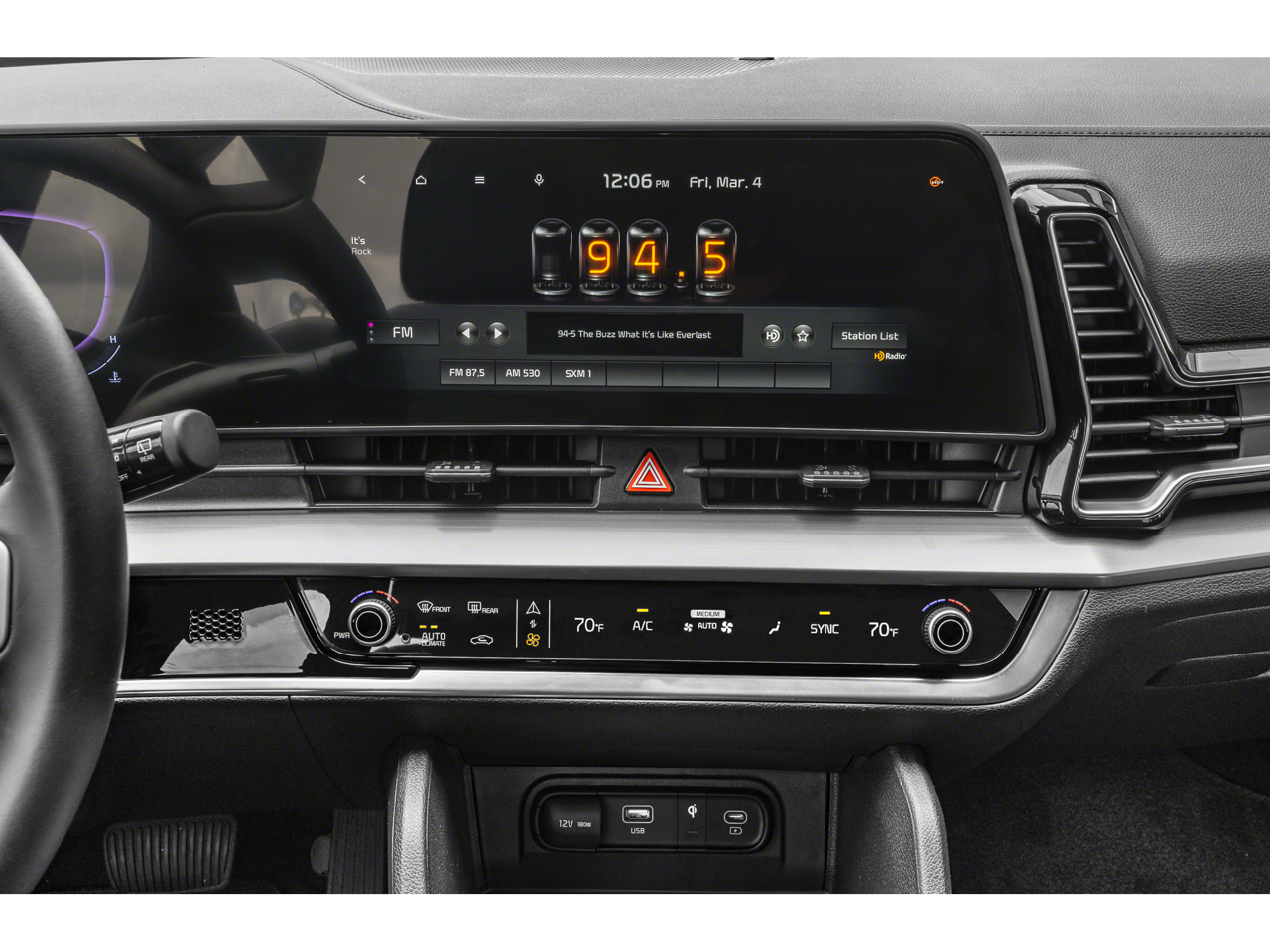 - Radio: AM/FM/HD Audio System -inc: 12.3" touchscreen w/navigation, 6 speakers, Apple Carplay and Android Auto, Kia Connect, voice recognition, WiFi, map OTA, satellite radio, steering wheel mounted audio controls and Bluetooth phone and streaming audio